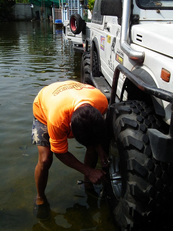 ขับรถไปช่วยน้ำท่วมก็ระวังกันบ้าง เดี๋ยวจะเป็นเหมือนนายช่างไม่โดนตะปูแต่โดนแก้วซะงั้น