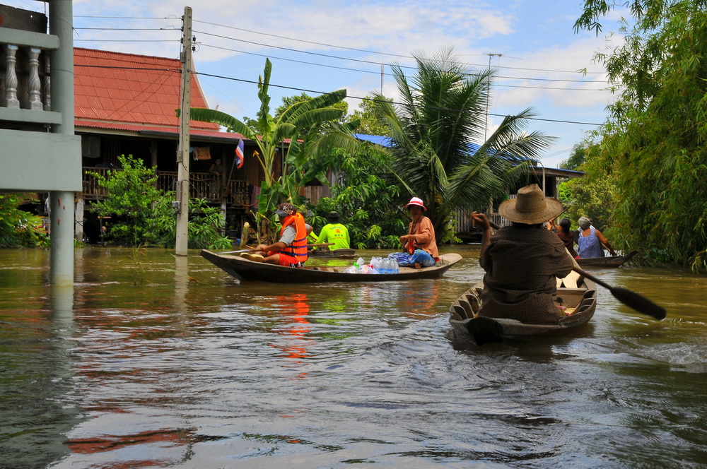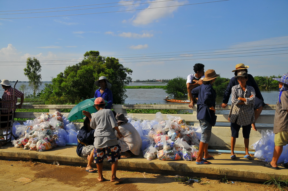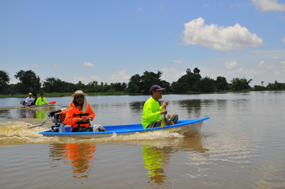 นำสิ่งของ ลงเรือออกแจกจ่ายตามบ้านเรือนที่ออกมารับสิ่งของไม่ได้