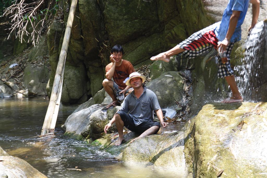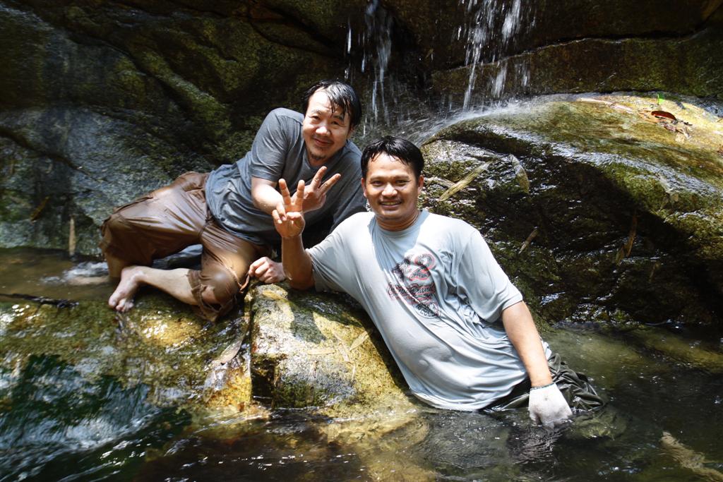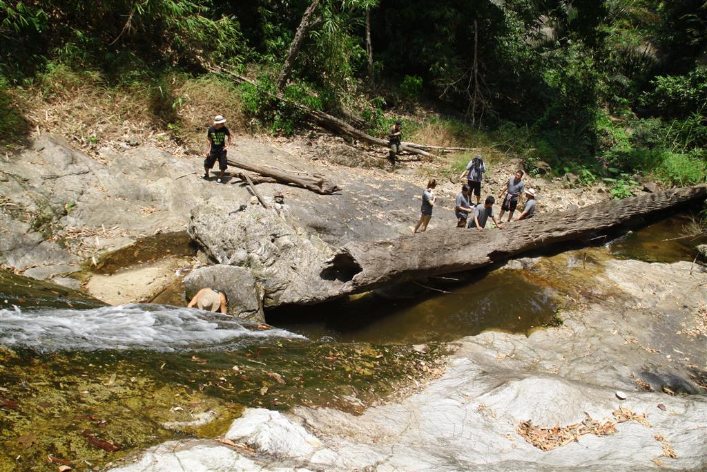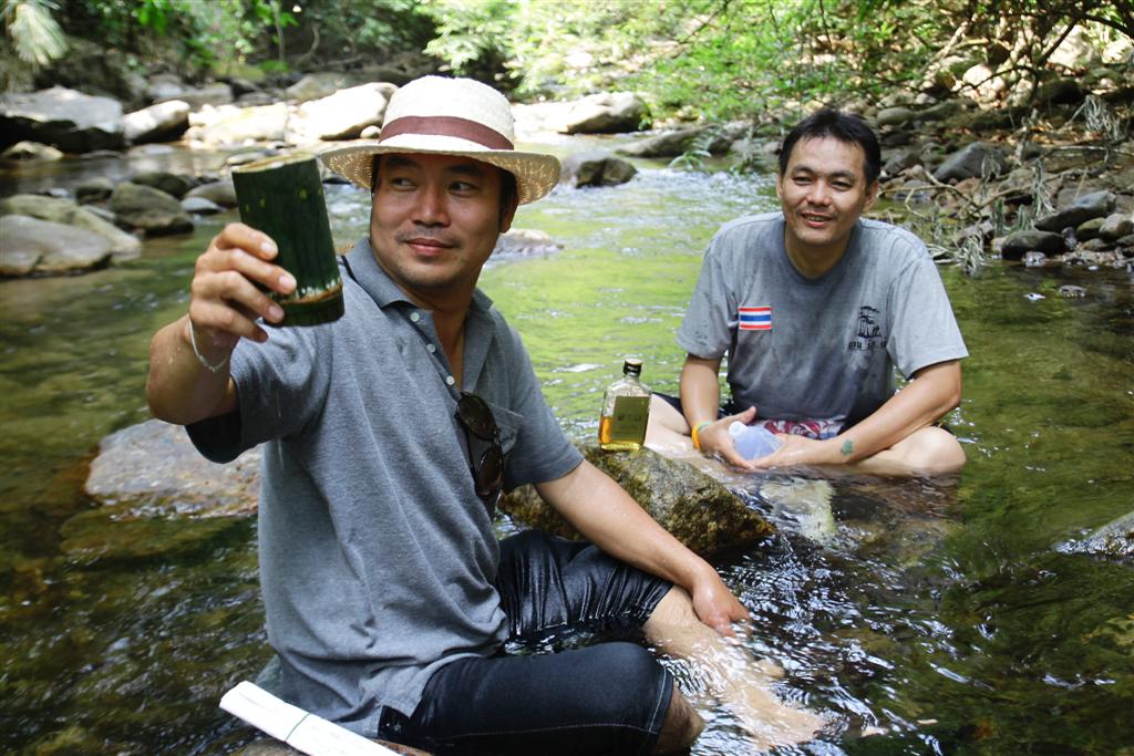 พักพอได้ให้จิบเหล้าก็เดินกันต่อ ดีว่ายังมีร่องรอยของชาวบ้านที่เข้ามาหาปลาไว้ ทำให้เดินเข้าน้ำตกได้ไม่ยาก
