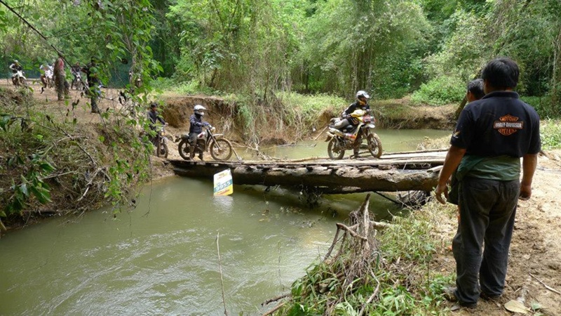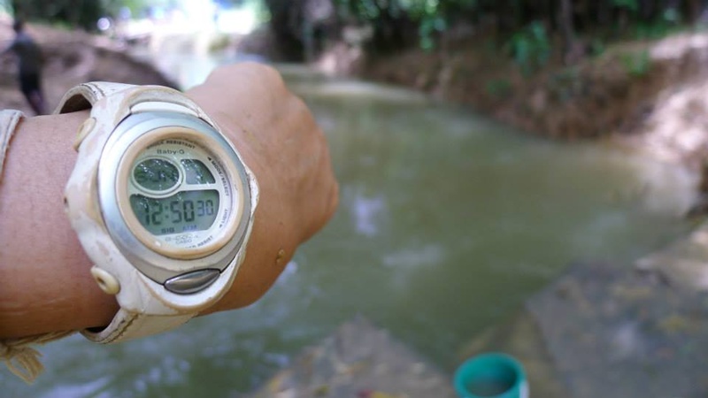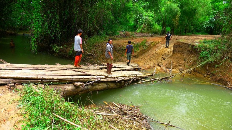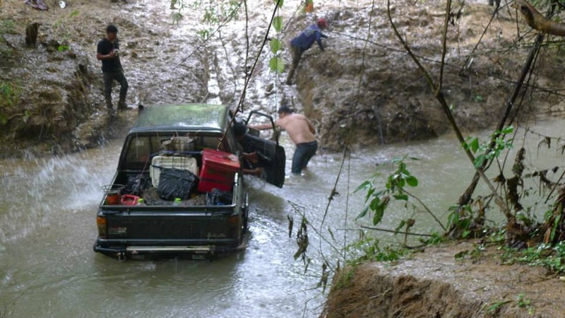 เช็คระดับน้ำกันหน่อย ข้ามสะพานท่าจะช้าและยากแน่ๆเอารถลงห้วยเลยดีกว่า ฝนก็เริ่มตกแล้ว กลัวน้ำป่ามาและแย่แน่ ต้องรีบๆแล้ว