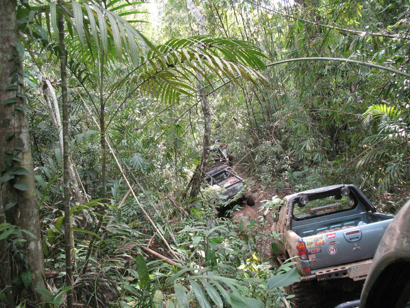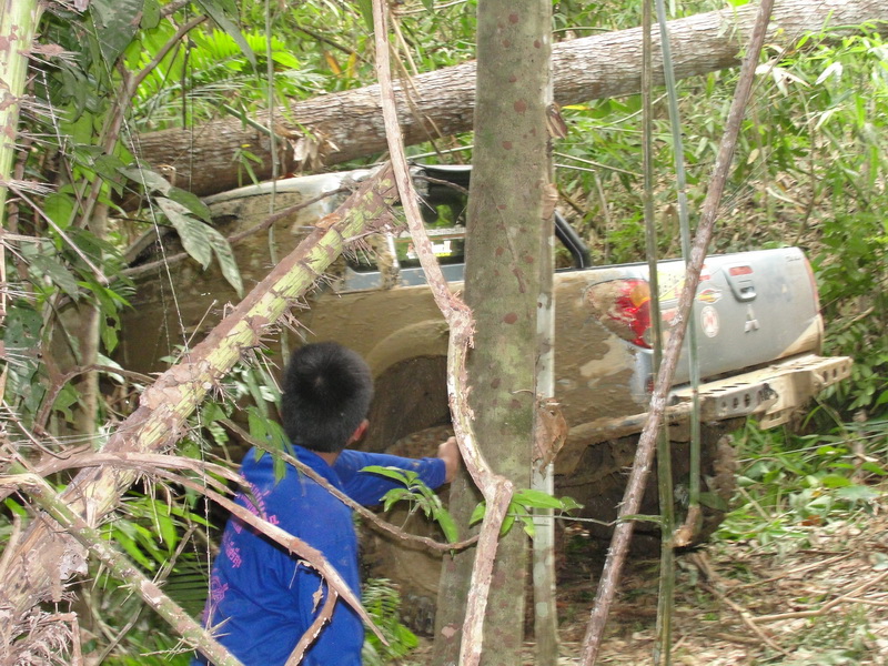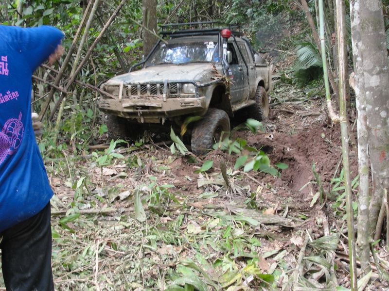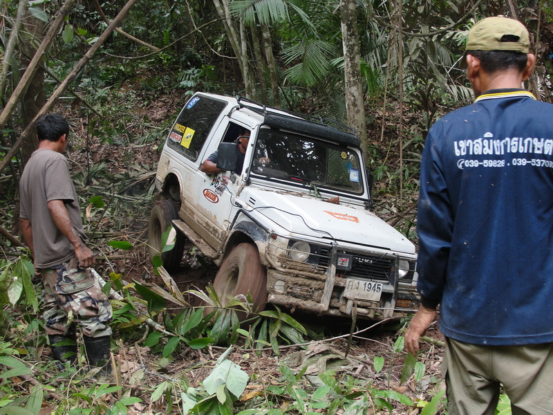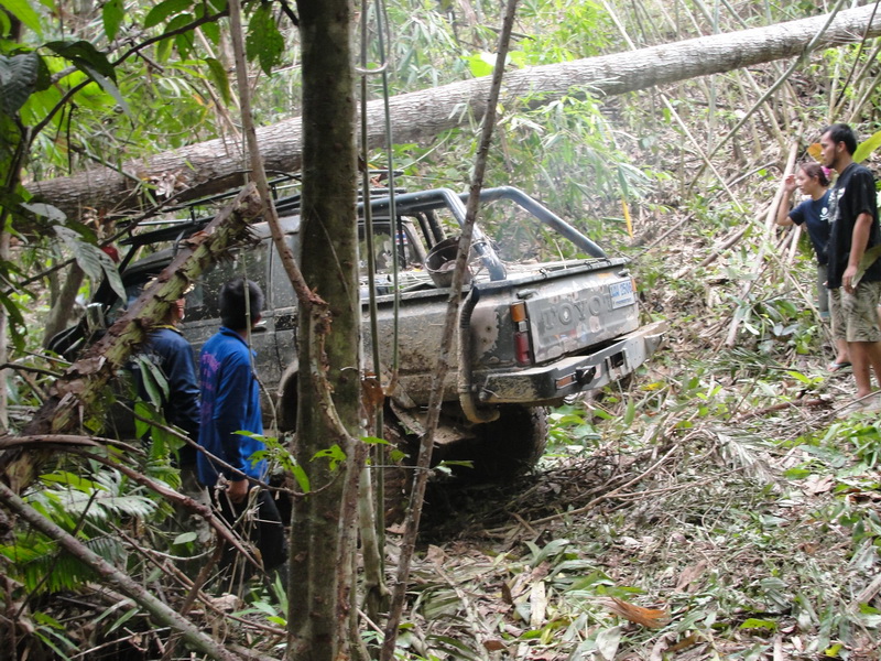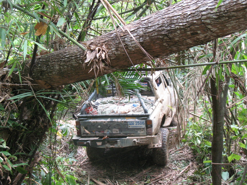 พ้นหลุม ออกไลน์ซ้าย ชิดขวาสุดเบียดต้นไม้ไว้ ยังไม่พ้นต้นไม้ที่ล้มอยู่...กองเชียร์ยืนลุ้น..ประมาณว่า แร็กหลังคา กลายเป็นแหลกไปแล้ว....