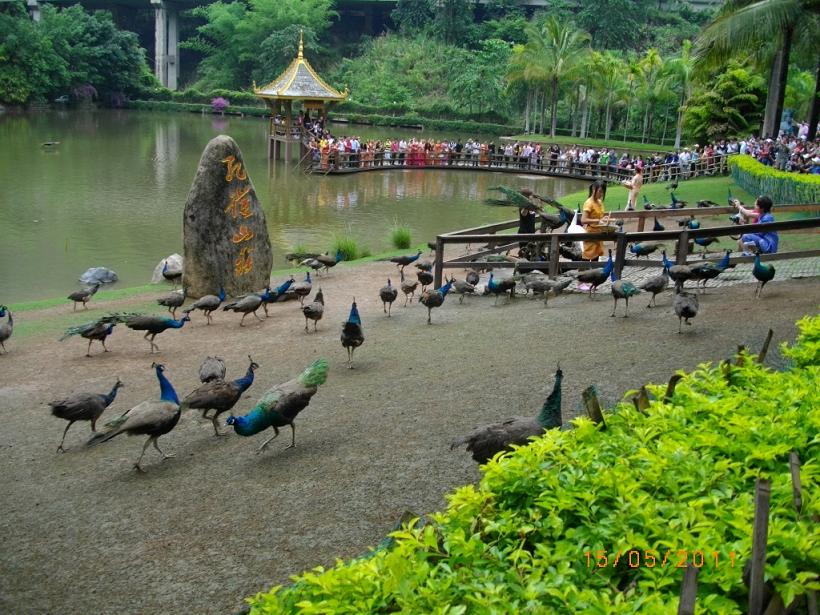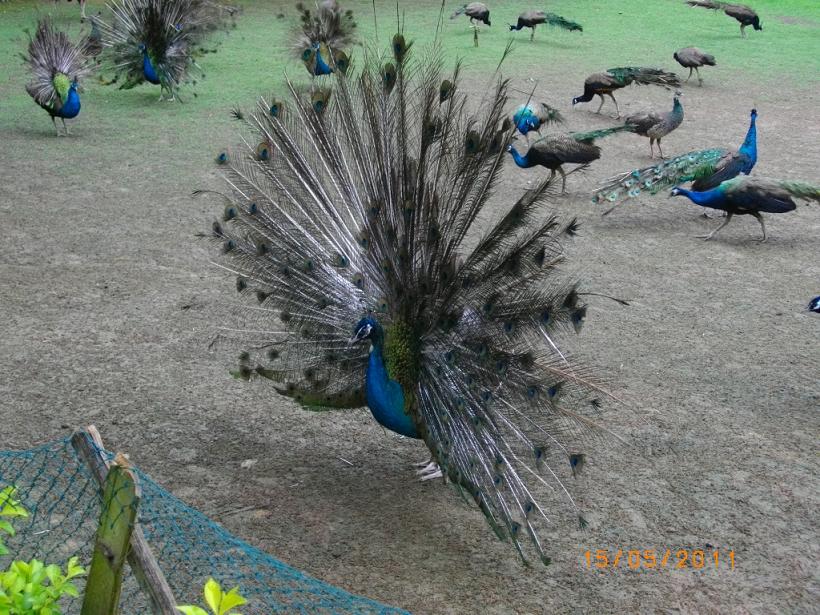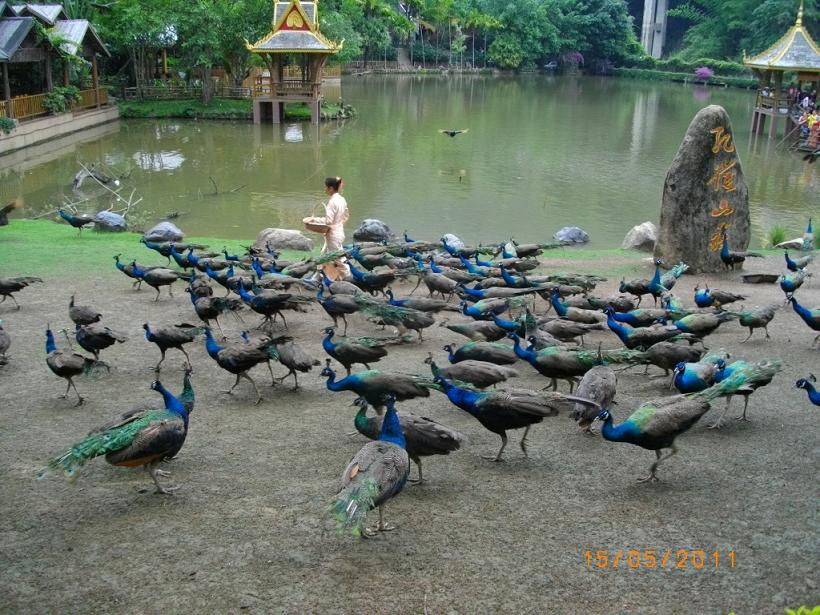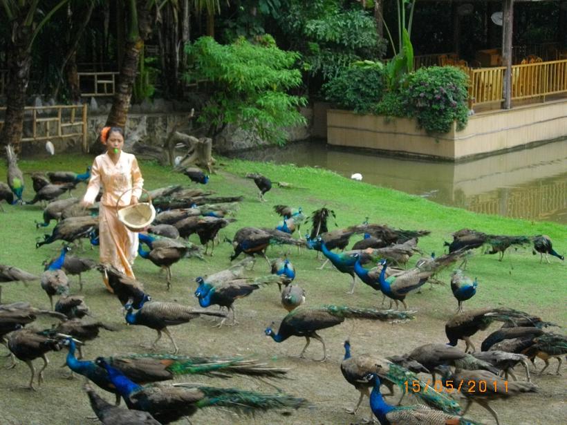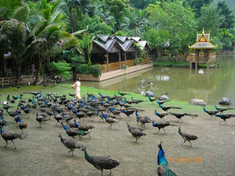 พอได้เวลาเจ้าหน้าที่ก็จะเป่านกหวีด แล้วเดินโปรยอาหาร นกยูงก็จะพากันบินมาจากราวป่าที่เห็นนั่นครับ