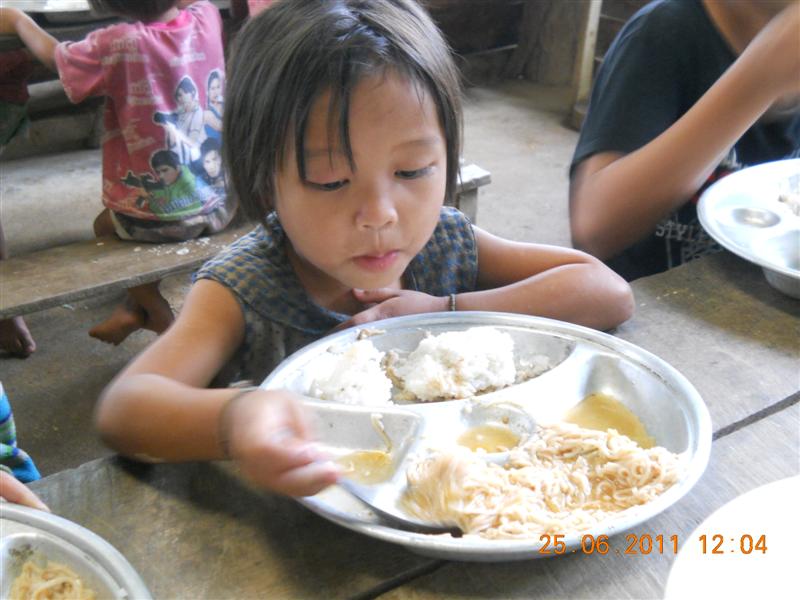 เมื่อได้เวลา ..ผมประทับใจที่นี่มากในเรื่องของ การให้เกียรติผู้ที่อาวุโสกว่า..น้องที่นั่งตักมาม่าต้ม คนนี้เป็น น้อง ที่อยู่บนดอย แต่มาช่วยครูทำงาน ทุกครั้งที่เด็กๆ มารับถาดมาม่าต้มจากแก จะต้องยกมือไหว้แกทุกคน ซึ่งปัจจุบันในพื้นราบในเมืองหาดูยากแล้ว