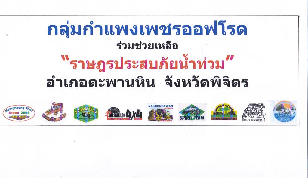 สถานการณ์น้ำท่วมในปีนี้ ค่อนข้างที่จะรุนแรงกว่าทุกๆปี นอกจากจะทำความเสียหายให้แก่พืชผลทางการเกษตรแล้วปีนี้ยังมีผู้เสียชีวิตอีกเป็นจำนวนมาก ซึ่งบางท้องที่จะท่วมซ้ำซาก ใช้ระยะเวลายาวนาน ดังเช่นจังหวัดพิจิตร ที่น้ำได้ท่วมขังเกินกว่า 1เดือน สยามไวเนอรี่ จึงร่วมกับ พันธมิตร ออฟโรดภาคเหนือตอนล่าง โดยมีชมรมกำแพงเพชรออฟโรด ร่วมกับชมรมสปิริตทีม จังหวัดพิจิตร ชาละวันแม่ปิง ผีบ้าออฟโรด บานาน่าทีม ลำน้ำปิง พิษณุโลก 4x4 นครสวรรค์ออฟโรด เมืองตากออฟโรด ได้จัดถุงยังชีพช่วยเหลือผู้ประสบภัย ในท้องที่ ต.งิ้วราย อ.เมืองจังหวัดพิจิตร และยังได้รับมอบน้ำดื่มจาก บริษัทไทยเบฟ ซึ่งได้เข้าร่วมกิจกรรมครั้งนี้ อีกทั้งยังได้จัดอาสาสมัครเข้าร่วมในกิจกรรมครั้งนี้ด้วย..