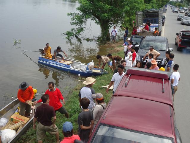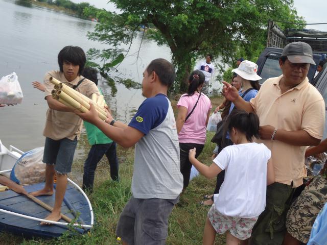 บรรยาดาศขณะขนของลงเรือเพื่อนำไปแจกจ่ายให้ถึงมือชาวบ้านที่ได้รับความเดือดร้อน