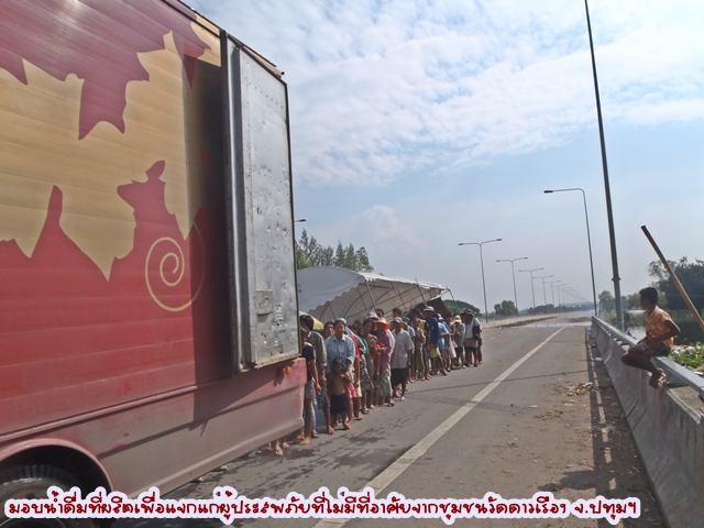 .....ในทุกๆ พื้นที่ของการส่งมอบสิ่งของช่วยเหลือผู้ประสบภัย เห็นได้ชัดถึงความลำบากของพี่น้องประชาชน หลายชีวิตยื้อแย่งสิ่งของบริจาค หลายชีวิตยังคงติดอยู่กับที่พักอาศัย บางครอบครัวมีทั้งเด็กเล็ก และผู้สูงอายุ การที่จะออกไปขอรับความช่วยเหลือจากภายนอก จึงเป็นเรื่องลำบากมาก จากระดับน้ำที่ท่วมสูง บางพื้นที่ระดับน้ำสูงจนท่วมหัวและยังส่งกลิ่นเห็นอย่างรุนแรง อาหาร น้ำดื่มและเครื่องยังชีพจึงมีความจำเป็นอย่างมาก และเมื่อมีผู้นำสิ่งเหล่านี้ส่งให้ถึงมือ รอยยิ้มแห่งความดีใจ ก็ได้ช่วยคลายความกังวล.....ว่าเราไม่ได้อยู่อย่างโดดเดี่ยวและไม่ถูกทอดทิ้งจากพี่น้องไทย แม้จะเป็นช่วงเวลาของความแตกแยกก็ตาม