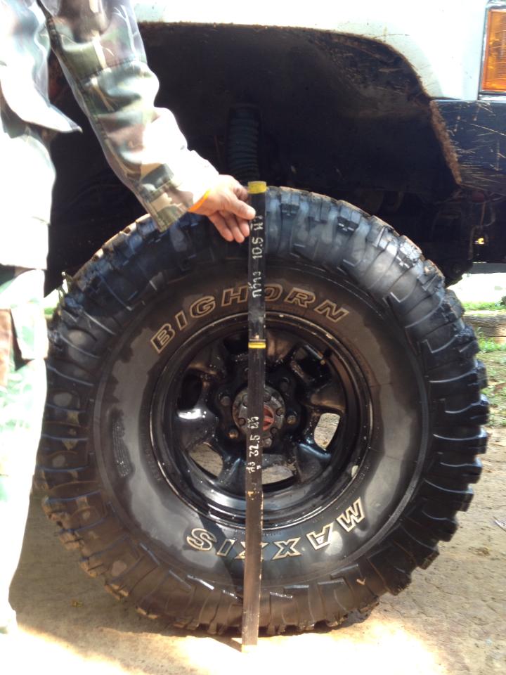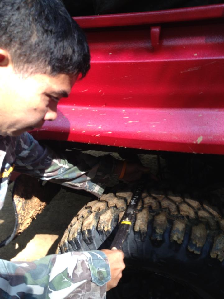 จนท.หน่วยสะเน่พ่องตรวจวัดขนาดและความสูงของยางต้องไม่เกินสูง32.5นิ้ว.ตามกฎกรมอุทยานฯปี2556