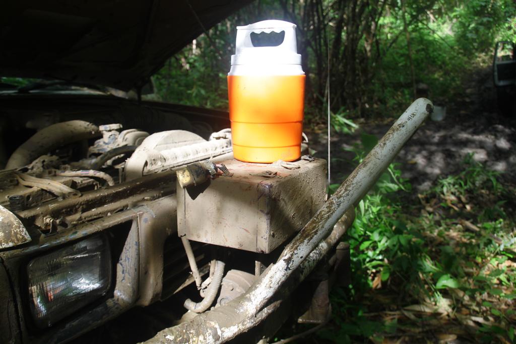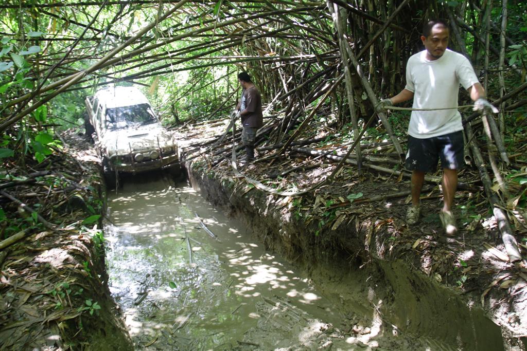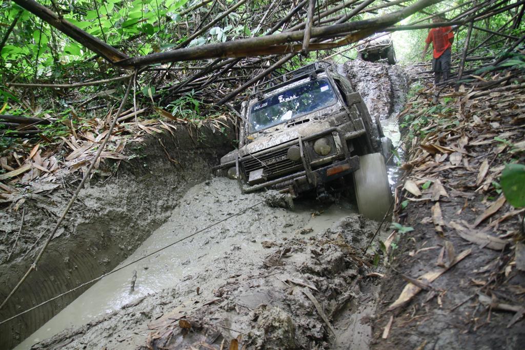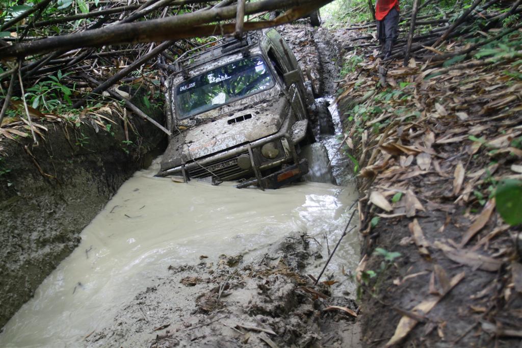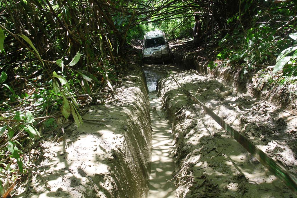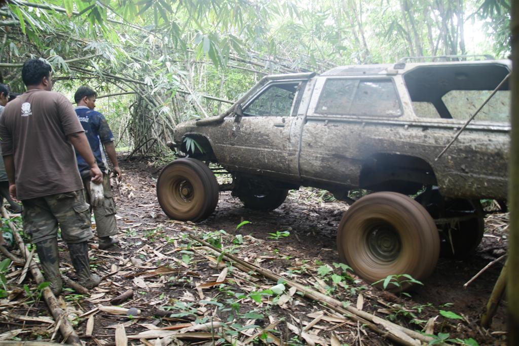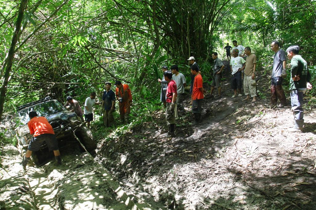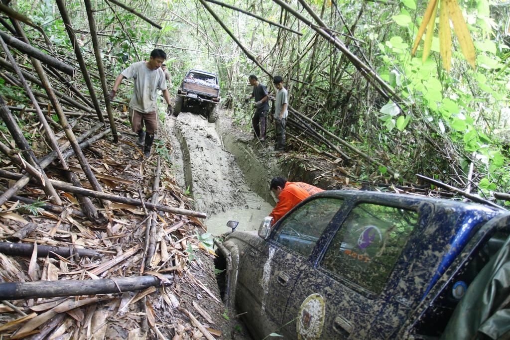 มีทางเลี่ยงขึ้นบนเนินแต่ชันและเอียงมาก รถไหลพิงต้นไม้ทุกคัน หันมาลงบ่อโคลนวิ้นขึ้นง่ายกว่า