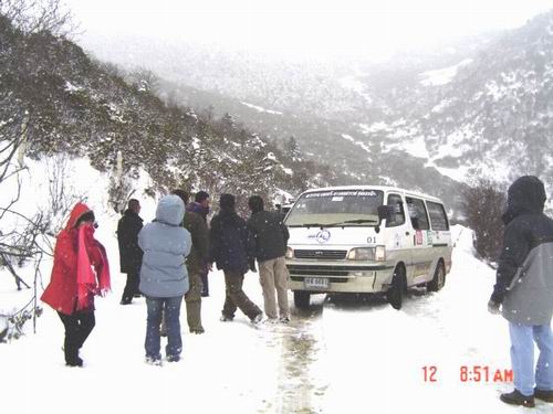 คณะหลังถึงจงเตี้ยนไล่หลังกันราว 2 ช.ม.ครึ่งเพราะรถติดบนเขายาวหลาย ก.ม. มีรถบัสนำนักท่องเที่ยวชาวไทยสวนทางไปเต๋อชิงติดค้างบนเขาจนเกือบถึงรุ่งเช้าของอีกวันหลายคณะด้วยกัน เพราะเผชิญกับพายุหิมะนอกฤดู