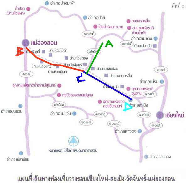 2).โปรแกรมที่คาดไว้คือ ห้วยน้ำดัง , ปาย-แม่ฮ่องสอน(น่าพักที่ไหนดี) ,โครงการหลวงวัดจันทร์ ,โครงการหลวงแม่สาใหม่(สะเมิง)..ถ้าเส้นทางจาก B-Cไม่สะดวกก้อจะตัดเป็น A-C
