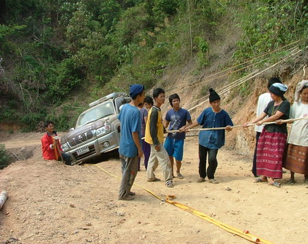 ช่วงวันหยุดสงกรานต์ 12-16 เม.ย.49 ผมและคณะได้ไปท่องเที่ยวจังหวัดแม่ฮ่องสอน ช่วงเส้นทางจากบ้านวัดจันทร์ไปอ.ช.น้ำตกแม่สุรินทร์จะปรากฏในแผนที่ทางหลวง เป็นเส้นสีเหลือง เมื่อไปถึงบ้านวัดจันทร์ในเวลาประมาณ 16.30 น.จึงได้ทราบจากชาวบ้านว่าเส้นทางดังกล่าวไม่มี แต่มีทางในป่าที่แยกจากบ้านห้วยตอง คณะจึงตัดสินใจ เลือกใช้เส้นทางนี้ แต่เนื่องจากความไม่ชำนาญเส้นทางและค่ำมืดลงเสียก่อน รถคันสุดท้าย ตกถนน ยี่งดึงยิ่งไหลลงเหว ผู้ช่วยผู้ใหญ่บ้านผ่านมาให้ความช่วยเหลือ แต่ด้วยความมืดและความอ่อนเพลีย จึงได้รับความอนุเคราะห์ ให้พักบนศูนย์ศึกษาหมู่บ้าน รุ่งขึ้นพระอาทิตย์ยังไม่ขึ้น ผู้ช่วย ฯ ใจดีของเรารีบขี่ จยย.ไปซื้อเชือกมาใช้เวลาไปกลับ 3 ชม.นอกจากนี้ท่านยังขอแรงชาวบ้านอีกกว่า 30 คนมาช่วยกันกู้รถ...ชาวคณะต้องขอกล่าวคำขอบคุณผ่านท่าน...คนไทยไม่เคยแล้งน้ำใจ
