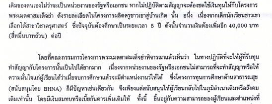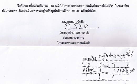 ทั้งนี้ในทุนการศึกษานี้ ผู้เขียนจะส่งมอบเงินจำนวน 170,000 บาทผ่านบัญชีของ ทุนการกุศลสมเด็จย่า เพื่อโครงการพระเมตตาสมเด็จย่า ภายในเดือนมีนาคม พ.ศ.2550 เพื่อให้ผู้ดูแลโครงการพระเมตตาสมเด็จย่า พิจารณาคัดเลือกนักเรียนภายใต้การดูแลของโครงการฯที่ถึงแม้ไม่สามารถสอบเข้าเรียนในสาขาการแพทย์หรือสาขาด้านสาธารณสุขอื่นๆ แต่สามารถสอบเข้าเรียนในมหาวิทยาลัยของรัฐในสาขาครุศาสตร์ ศึกษาศาสตร์ สังคมศาสตร์ ตามลำดับ ในปีการศึกษา 2550 จำนวน 1 ทุน โดยโครงการพระเมตตาจะเป็นผู้สั่งจ่ายให้กับมหาวิทยาลัยเป็นค่าเล่าเรียนเป็นรายภาคการศึกษา โดยแยกจ่ายในปีแรก 50,000 บาท ปีต่อไปปีละ 40,000 บาท 3 ปี เงินส่วนที่เหลือนอกเหนือจากค่าเล่าเรียน ก็จะให้เบิกเป็นค่าใช้จ่ายอื่นๆในระหว่างที่เรียนจากทุนในแต่ละปี โดยที่โครงการพระเมตตาสมเด็จย่า จะสนับสนุนการศึกษาของนักเรียนทุนนี้จนจบการศึกษาในระดับปริญญาตรี(4ปี)