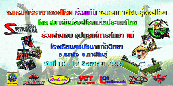 ชมรมศรีราชาออฟโรดร่วมกับชมรมกาฬสินธุ์ออฟโรด โดยสมาพันธ์ออฟโรดแห่งประเทศไทย ขอเชิญร่วมกิจกรรม ส่งมอบอุปกรณ์ สื่อการเรียนการสอน ให้กับเด็กนักเรียน ณ โรงเรียนดงบังนาแก้ววิทยา อ.สมเด็จ จ.กาฬสินธุ์ วันจันทร์ที่ 11 สิงหาคม 2551