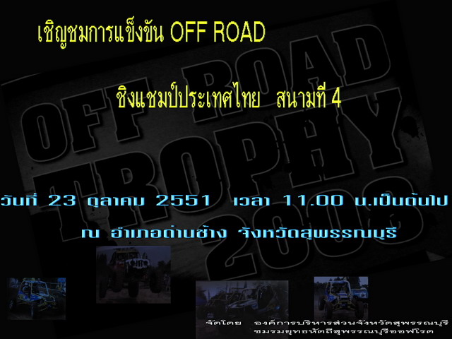 ขอเชิญสมาชิกที่มีหัวใจเป็นออฟโรด ร่วมสัมผัสกับบรรยากาศของการแข่งขันออฟโรด ในรายการแข่งขันรถยนต์ขับเคลื่อนสี่ล้อ ชิงแชมป์ประเทศไทย สนามที่ 4 ณ อำเภอด่านช้าง จังหวัดสุพรรณบุรี ท่านจะได้พบกับธรรมชาติที่ถูกโอบล้อมด้วยผืนน้ำของ เขื่อนกระเสียว และขุนเขาที่เรียงรายของ อุทยานแห่งชาติพุเตย และชมการแข่งขันที่ตื่นเต้นเร้าใจ จากนักแข่งดังมากมายจากทั่วประเทศ ที่มาปะลองฝีมือในการแข่งขันเพื่อชิงความเป็นหนึ่ง ที่เดิมพันธ์ด้วยตำแหน่ง แชมป์ประเทศไทย
