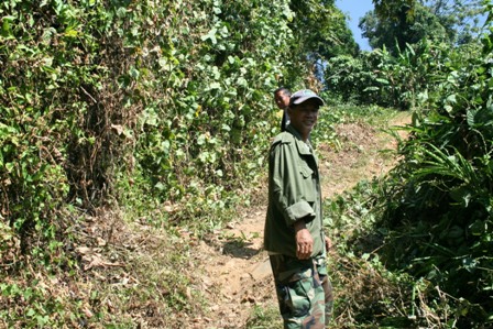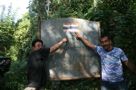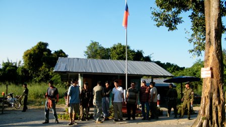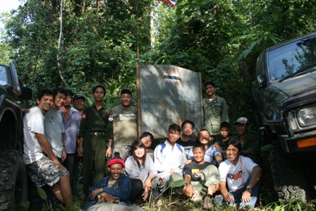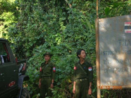 คำตอบที่ 122 เมื่อเรามาถึงเขตรอยต่อชายแดน ก็พบกับเจ้าหน้าที่ฝั่งพม่ายืนรอเราอยู่ เพื่อรอรับสิ่งของอุปโภค,บริโภคที่ทางผู้พันของพม่าได้จัดเตรียมนำขึ้นมาส่ง.....ด้านหน้าป้ายเป็นดินแดนของประเทศไทย ส่วนด้านหลังป้ายเป็นดินแดนของประเทศพม่าครับ