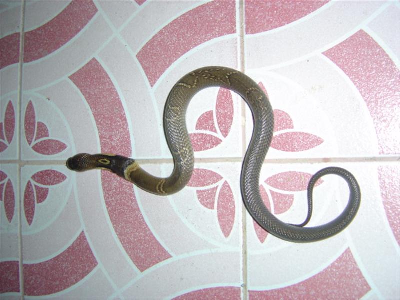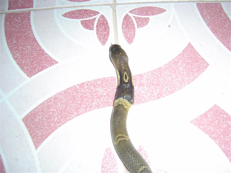 งูเห่าหม้อครับ งูเห่าชนิดนี้พิษร้ายมาก แถมยังดุอีกด้วยถ้าโตเต็มที่ ดุกว่าจงอางอีก เป็นงูชนิดเดียวที่ผมไม่อยากจะเจอเลย เวลาเข้าป่า ดูเปรียบเทียบจากแผ่นกระเบื้องน่าจะยังเล็กๆ อยู่ คาดว่าคงเป็นตัวลูก อย่าวางใจว่าจะมีแค่ตัวเดียว