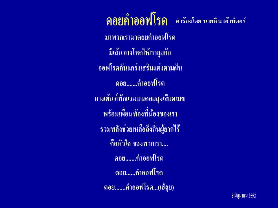 คืนนั้นสุดสงสารJR สุดๆ นอนทับขุ่ยมดง่ามที่ถูกน้ำฝนท่วมรัง มันหนีน้ำขึ้นมานอนที่เต้นท์ JR ไม่ถูกมดรูมแทะเนื้อจนหมดตัวก็บุญถมแล้ว ฑ เอ้ย........ วันนี้เพิ่งแต่งเพลงให้ดอยคำเสร็จ อีกไม่นานคงร้องลั่นป่าทุกทริปแน่ๆ.....ทำนองมันส์ โจ๊ะๆ....มาชมเนื้อร้องก่อนครับ หวังคงถูกใจชาวดอยคำออฟโรด...