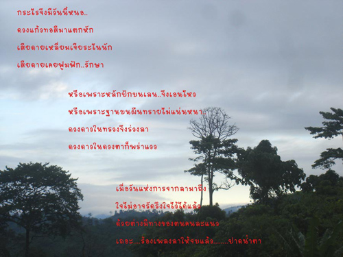 เอา มีกำลังจัยจากพี่ชายด้วยขอบจัยครับ แต่หัวจัยมันก็ยังไม่หายดี นอนตึกตื่นเช้าถ้ารู้สึกตัวตอนนอนมันไม่สามารถหลับได้อีกเลย หน้าเขาลอยเต็มไปหมดเลย แล้วจะต้องทำอย่างไงดี วันที่2 3 4 ของการเดินทางผมตะโกนอยู่ที่อช.เจ้าหน้าที่เขานึกว่าบ้า ดีน่ะที่ไม่มีนักท่องเที่ยว ร้องไห้ มันน่าอายหรือป่าวครับลูกผู้ชาย ขอบใจคับพี่เจิน
