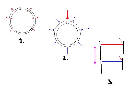 1. แหวนเนี่ย ปกติแล้ว.. จะเป็นเหมือนสปริงตัวหนึ่ง.. มันจะมีแรง ดัน ออกไป ตามลูกศร.ออก.. และก็จะมีรอยต่อของแหวนที่ห่าง ๆ ครับ..