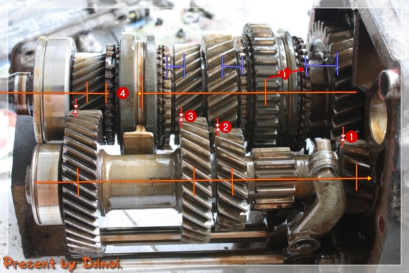6.หมายเลข กำกับ.. ชุดเฟือง ก็คือ เบอร์เกียร์ครับ.. (เกียร์ 1 ลูกส่งเล็กสุด ลูกรับใหญ่สุด) ส่วนเกียร์ 4 จะไม่มีเฟือง.. จะใช้ต่อตรง ๆ กับแกนเพลาครับ