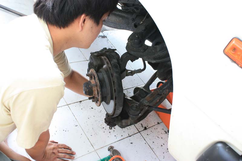 ต้องยกรถขึ้นด้วยแม่แรง.. มีขาตั้งรถเอาไว้.. (เพราะจะต้องถอดล้อ. โช๊ค. ปีกนกล่าง เทอชั่นบาร์)