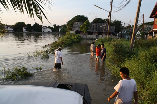 พวกเราก็หยุดถามเส้นทางและกินข้าวเหนียวหมูกันไปพรางๆ กับคนแถวนั้นที่บ้านน้ำท่วม เลยต้องมาก่อเพิงตั้งเต็นอยู่ริมถนน
