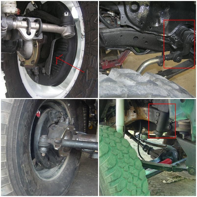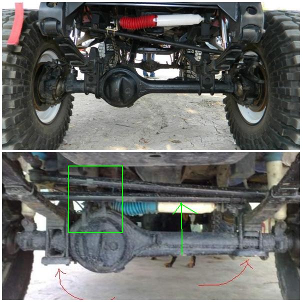-ล่าง...รถ106 ถูกยก 4 นิ้ว ชิ้นส่วนที่เหมือนตัว Z คือวิธีปรับชิ้นส่วนตามการยก ไม่ใช่สแคนดาร์ด แต่หลักการเหมือนเดิม ศรสีเขียวชี้คันชัก ..ศรสีแดงแสดงแนวการดึงไปกลับ(ขนานไปกับแชสซี)...กรอบสีเขียวคือหูยึดเหล็ก(กันเพลาพลิก) ซึ่งมีในคาน 106,65 เป็นความหมายคู่กับคันชักพวงมาลัย...เช่นรถ 106 ที่เปลี่ยนระบบเลี้ยวเป็นแบบกวาดหน้าแต่ยังใช้คานเดิม หูจะว่างไม่มีเหล็กกันเพลาพลิก เนื่องจากคันชักจะติด หมายถึงถ้ากวาดหน้าต้องถอดเหล็กนี้ออกครับ...