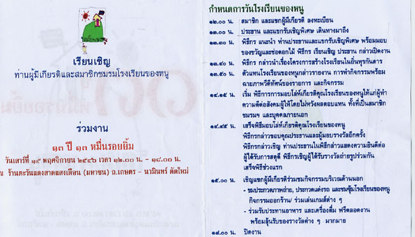 เนื่องจากผมไม่สามารถที่จะส่งการ์ดเชิญให้พี่น้องและผองเพื่อนได้ครบทุกท่าน ก็เลยใช้ ณ ที่ตรงนี้ส่งการ์ดเชิญเลยนะครับ คือในวันที่๑๓พ.ย.๔๖ผมจัดงานครบรอบ๑๓ปีโรงเรียนของหนูขึ้นที่บ้านตะวันแดงสาดแสงเดือน ถนนเกษตร-นวมินทร์ ในงานก็เริ่มตั้งแต่เช้า ก็มีการโชว์รถของชมรมต่างๆที่มาโชว์นี้ก็จะให้ผู้ชมได้มีความรู้ทางการแต่งรถด้วย ว่าแต่งแบบของท่านแล้วจะเป็นอย่างไร ใช้จ่ายเท่าใด โดยรถที่มาโชว์นี้ก็เป็นของชมรมต่างๆส่งเข้ามา ชมรมละ๒คันพร้อมวิทยากรด้วย ก็เชิญชมรมท่านด้วยนะครับให้ส่งรถที่แต่งแล้วเข้ามาให้ความรู้กับผู้ชม พร้อมทั้งมีประกวดรถประเภทแต่สวยงาม โหด พร้อมลุยเรามีรางวัลให้ด้วย พร้อมกระนี้ผมก็จะเชิญชมรมต่างๆเข้าร่วมโครงการ สร้างโรงเรียนในปีหน้าด้วย รายละเอียดเราจะคุยกันในงาน รับรองท่านต้องชอบโครงการนี้แน่ ไม่เสียเงิน แต่ได้กุศล สนใจร่วมงานติดต่อได้ที่ 02 9642250-1ท่านที่เป็นประธานชมรมช่วยแจ้งต่อให้สมาชิกท่านด้วยนะครับ
