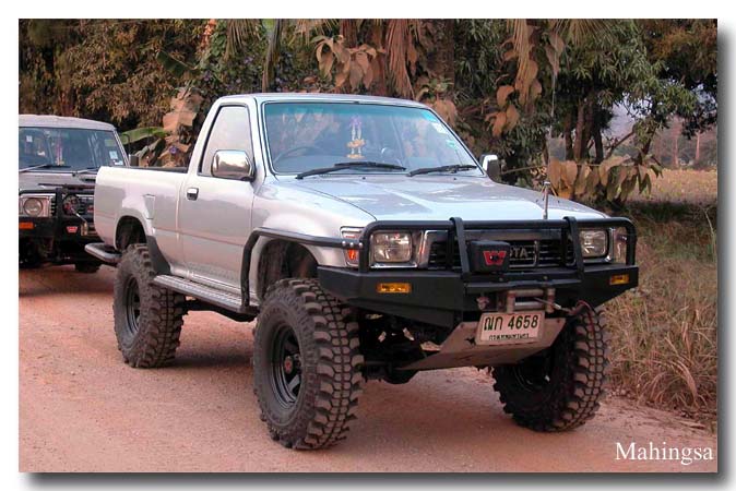 ผมก็มีคันนีงเป็น TOYOTA LN-46 ครับ ช่วงล่างแหนบของเดิม เกียร์เดิมมี 4 เกียร์ โช๊คเรนโช 9000 ปรับ 5 ระดับ เปลี่ยนเครื่องเป็น 2Lติดเทอร์โบ ก่อนใส่ยาง235x75 R15 วิ่งได้ ประมาณ 110 กม.ยังเหยียบได้อีก แต่.... ตอนนี้เปลี่ยนเป็นยาง MUT 31 ยังไม่ได้ลองเหยียบ อ้อลืมบอกไปเปลี่ยนบอดี้เป็นไมตี้ปี96 ตัดกระบะออกนิดหน่อย ติดสนอกเกิ้ลทำเอง ชอบมากกำลังหาทางแต่งหล่อไปเรื่อยๆครัรบ