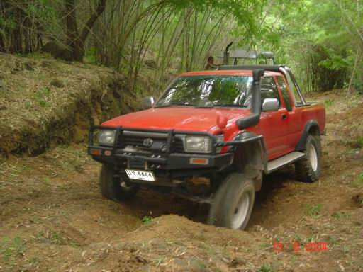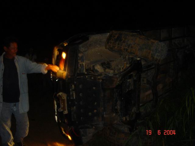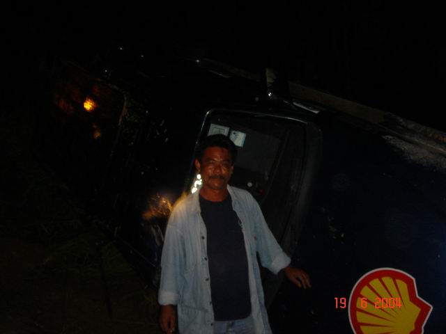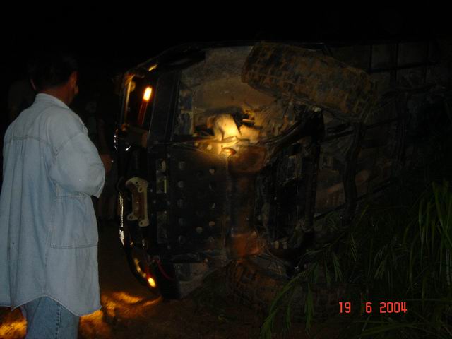 พอขับลงเขามาได้ซักเกือบครึ่งทางก็เจอทางแบบหลุมสลับดักซ้ายขวา( เราเดินทางกลับเส้นทางเดิม ร.ร.เทคนิคฯ )ซึ่งขาลงนั้นจะยากกว่าขาขึ้นอีกหลายเท่าตัวบังคับพวงมาลัยไม่ถูกทิศทาง....วางล้อไม่ตรงต่ำแหน่ง...ข้อสำคับบรรยากาศตอนนี้มืดมากเลย...ฝนก้อโปรยปรายลงมาเป็นระยะ..เส้นทางข้างหน้าก้อมองได้ไม่ถนัดหนัก...พอมาเจอโค้งหักศอกขวาลงเนินชัน...ด้านซ้ายเป็นหุบซึ่งอาจจะดูว่าไม่ลึกนัก....แต่ไม่สมควรที่จะไปเลียบๆเคียงด้านนั้นให้มากนักเพราะว่าถ้าเกิดหลุดลงไปแล้วถึงคงต้องกู้กันนานแน่ๆ....ครั้นจะวางล้อมาทางขวาเยอะๆก้อมีสิทธิ์พลิกได้อย่างง่าย...ข้องสำคัญทุกคนมองไม่เห็นไลน์กันแล้ว....จนสุดท้าย.....ก้อผ่านมาได้สำหรับโค้งนั้น...จนกระทั่งนี่แหล่ะ