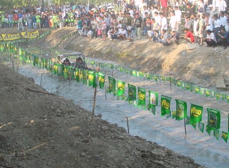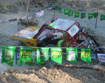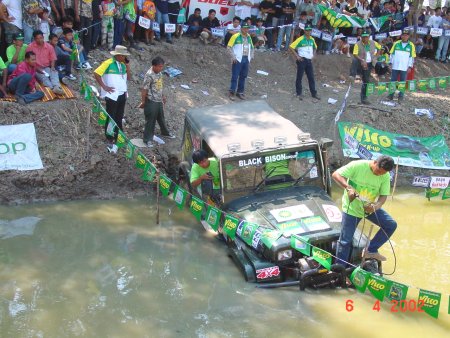 รถแข่งคันแรกของทีม " BLACK BISON " พลาดท่าครับ ลงบ่อน้ำ หักเลี้ยวไม่พ้น ทำให้เสียเวลาในส่วนนี้มากพอสมควรครับ