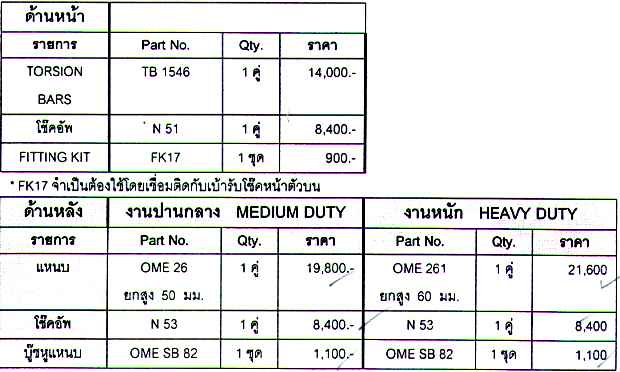 I think Khun ขนมิ้ง answered for me already. About the suspension set for a 2 in. lift, I don't know if you think the ride you have now is too soft or too firm for a 4 door RANGER. For a 2-dr. model, the ride is a bit too hard to begin with so a softer but firm ( ? ) set is suitable. If you need a ride like that, I think a set of OME should be the one for you. Just tell the shop that you need a comfortable ride. I think OME have different set-ups to choose. For a truely offroad use, there are many brands such as ProComp, Black Diamond XT, etc. Anyone who uses these is more qualified to answer than me. One thing I heard from the shop is that an adjustable shock has to be adjusted often to prevent the knob from getting stuck. After a while the mud and water can get inside and make it useless or the knob will be broken so you will end up with a one stage shock. If I were you, I would go up to 31 inches max. Remember that bigger tyre is also wider and heavier, so it will put a lot more stress on all suspension parts. RANGER comes with tyre that is about 27-28 inches, I think. So the company do not design all the parts to deal wirh much bigger and heavier tyre. If your RANGER is a show car, anything is OK.