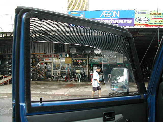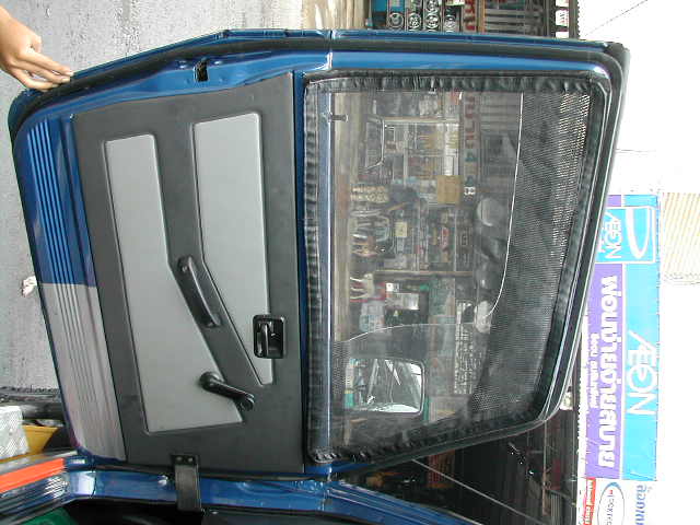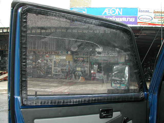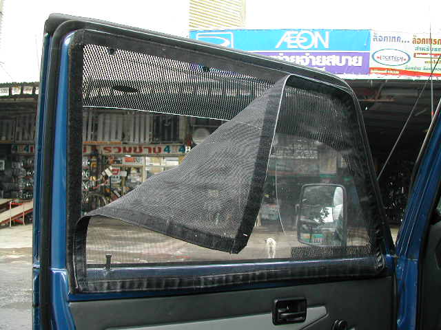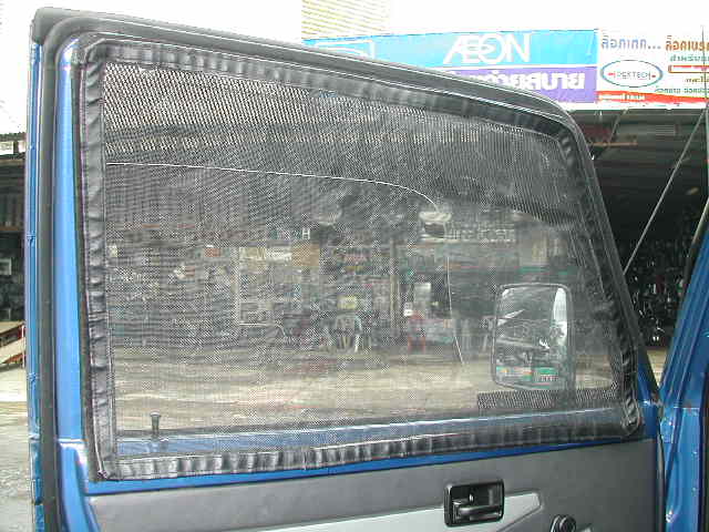 รูปร่างเมื่อเอากระจกรถลงแล้วนำ มุ้งที่เขาเย็บขอบเรียบร้อยใส่เข้าไปในร่องยางแทนกระจกจะใส่ได้พอดี หมดปัญหาเรื่องแมลงสัตว์ตัวเล็กๆ แถมได้อากาศบริสุทธิ์และลมเย็นสบาย (มีกับรถเล็กเกือบทุกชนิด)