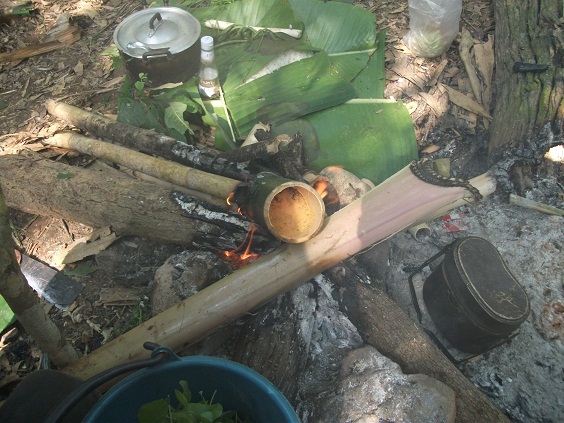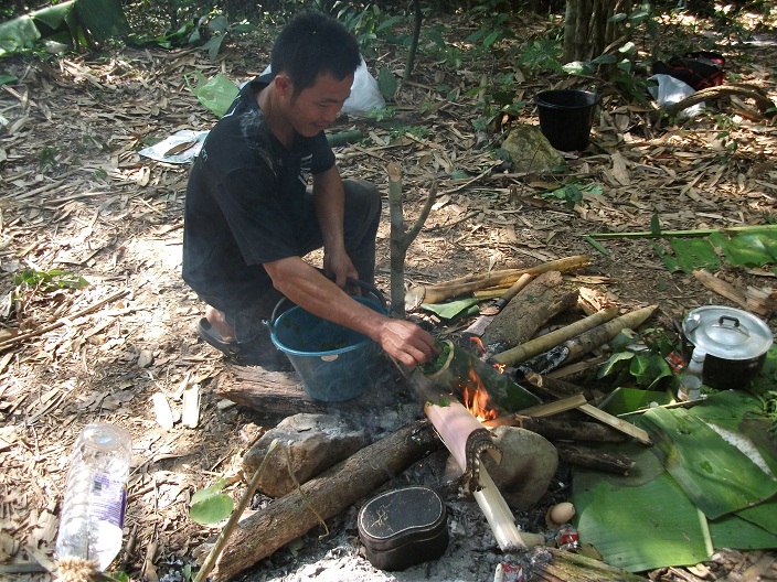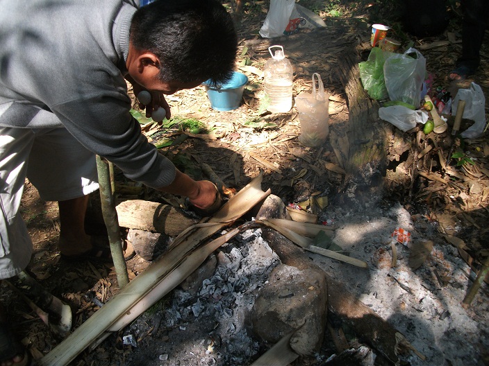 กำลังต้มไข่ในกระบอกไม้ไผ่