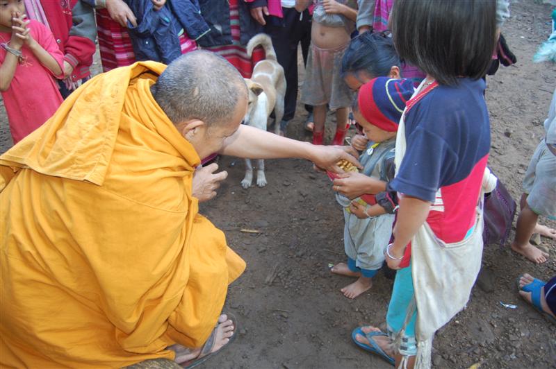 พระอาจารย์กำลังแจกขนมเด็กๆ ซึ่งเราได้เตรียมไปเยอะพอสมควร