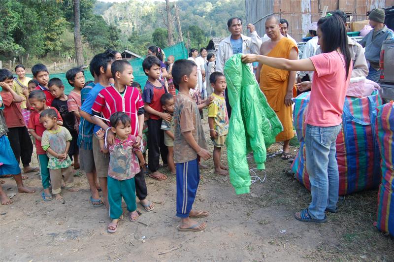 คุณครูฝ้ายกำลังขมักเขม้นแจกเสื้อกันหนาวให้เด็กๆ
