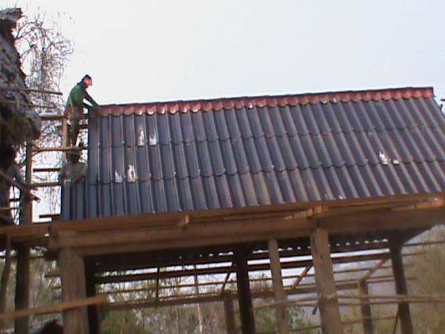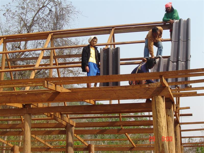 หลังจากให้ช่างและชาวบ้านช่วยกันตั้งเสาตีโครงเสร็จแล้ว ก็เริ่มมุงหลังคาด้วยแผ่นกระเบื้องที่เราได้ช่วยกันนำขึ้นไป
