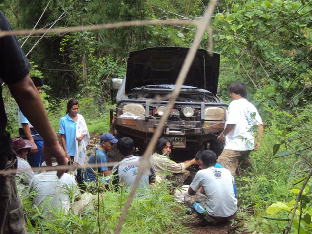 ทางพี่อ้นเลยเปลี่ยนใจให้ พี่หนึ่งมาวิ้นรถพี่เล็กแทนเอาขึ้นมาแล้วมาซ่อมกันข้างบน ล็อกให้เพลาข้างหนึ่งหมุน ช่างมวลเปิดเพื่อเชื่อมดอกจอกให้ขัดกันไว้ด้านหนึ่ง ถึงตรวนี้พวกเราเก้าคันเดินทางมาได้เพียง 1 กิโลเมตร ดูเวลาก็ป้าเข้าไปบ่ายสองแล้ว เหลืออีกยาว เลยพักกินข้าวกันตรงนี้ก่อนเพื่อสู้กันต่อ เราออกเดินทางกันต่อก็ต้องใช้เวลา พี่นันต้องกลับมาลากเพื่อนคือพี่เล็กตลอดทาง แค่ลำพังรถคันเดยวก็ขึ้นยากแล้วเพราะเป็นทางขึ้นตลอด ในช่วงนีใช้เวลาอีกสามชั่วโมงโดยได้ทางพี่อ้นคอยดูแลตลอดทาง อีก 3 กิโลเมตรเรามาถึงต้นไม้ล้มก็เกือบห้าโมงเย็น พี่แก่ดูแล้วบอกเอาลายเหมือนขามา ก็ผ่านมาได้ทุกคัน หมดช่วงนี้ก็เดินทางกันมาทำความเร็วกันได้ไม่เกินสองกิโลเมตรต่อชั่วโมงเพราะต้องค่อยประคองรถพี่เล็กออกมา และช่วงกลางคืนด้วยผู้นำต้องค่อยดูลูกทีมที่ตามมากลัวมาผิดลาย รอบนี้ ว เป็นสิ่งสำคัญมาก ต้องมีทุกคัน เพราะจะได้สื่อสารและช่วยกันได้ง่าย เราไม่ต้องกินข้าวเย็นเราหลุดมาถึงหน้าหมู่บ้านประมาณ เที่ยงคืน แล้วแล้วเราเดินทางต่อไปแวะเติมน้ำมันที่ป็ม ปตท ก็มีคนนอนพักก่อน และมีบางคันจับกลุ่มกันกลับบ้านเพราะมีงานในตอนเช้า
