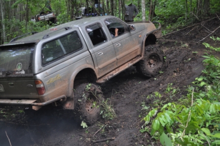 แล้วเราก็เริ่มออกเดินทางกลับโดย พี่แก่ขอนลอยเป็น ลีด พี่อ้นเป็นหัวหน้าชุด ค่อยดูแล มีพี่แสน พี่เต่า เป็นลูกมือค่อย บอกลาย เริ่มออกกันตอน สิบเอ็ดโมง ช่วงจัดขบวนหันหัวขึ้นก็ออกอาการลื่นปลิ้นไปมาแล้วเพราะมีหินบวกกับดินลื่นมาก เสียงเครื่องแต่ละคนเร่งรอบบวกกับการเลื่อกเกียร์ของรถแต่ละคันมาใช้ ทำให้ทุกคนต้องใช้ทักษะประสานกับของที่ใส่กันเขาไปนำมาใช้ให้พร้อมกันขึ้นมาได้สองร้อยเมตนก็ต้องมีว้นกันแล้งเพราะมาหินใหญ่ดักล็อกล้อเอาไว้ทำให้เร่งไม่ขึ้นแม้บางคันของครบก็อยากเพราะต้องถนอมเอาไว้ระยะทางอีกยาวไกล ไม่มีใครอยากกินข้าวลิง ดังนั้น winch ของแต่ละคันจึงถูกเรียกมาใช้ทันทีมีครบทุกยี่ย้อเช่นกันในทริปนี้ ในช่วงกำลังวิ้นกันอยู่หันไปอีที ช่างมวลเปิดลายใหม่ออกซ้ายให้ลูกค้าที่ตามมาออกซ้ายไปซะแล้ว ไปกันได้ตามสบายเลย คันที่วิ้นอยู่ถึงกับคิดไม่น่าตามลีดมาเลย หลังจากหลุดช่วงนี้มาก็เป็นทางขึ้นยาวประมาณ 50 เมตรเป็นหินปนดินเช่นกันต้องส่งกันขึ้นมา สุดท้านมิตซู ปีกนกงานเข้า ปั่นขึ้นมา เพลาขาด WINCH ก็มีปัญหาคุยกันว่ากลับไปของจีนต้องเปลี่ยนแล้ว พี่เอก ต้องหาทางกลับรถกลางเนินหันหัวมา winch (ทำให้พี่เอกต้องนึกถึงวิ้นหลังจะได้ไม่ต้องกลับรถ) สายสลึงบวกกับผ้าใบอีกสองเส้นถึงจะพอ วิ้นขึ้นมาได้ พี่เอก ก็ต้องกลับรถใหม่ขับขึ้นไปอีก ห้าสิบเมตรแล้วกลับหัวมา winch ใหม่งานก็เขาอีก โยกกลับไปกลับมา สายแรงดันสูงป็มน้ำมันพาวเวอร์แตก ได้ช่างมวลบอกอย่าดันทุรังให้ดับเครื่องเดี่ยวจะต้องเปลียนป็มพาวเวอร์ใหม่ ช่างมวลบอกว่าจะแก้ไขช่วงคราวให้ก่อนโดยตัดสายแรงดันต่ำออกแล้วต่อท่อยางไหลกลับไห้มีน้ำมันเลี้ยงป็ม แต่พาวอร์ใช้ไม่ได้แล้ว พี่เอกกล้ามขึ้นเลยหลังจากจบทริปนี้ แต่ไม่ต้องเสียเงินซื้อป็มใหม่ (มีช่างมาด้วยก็ดีอย่างนี้เอง)
