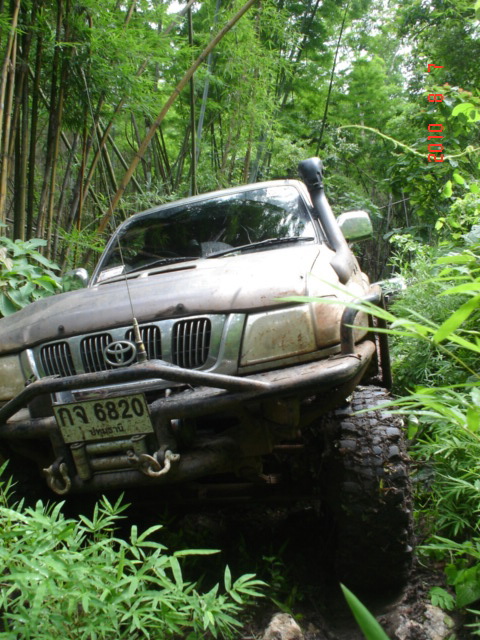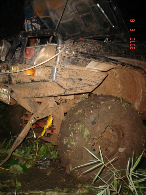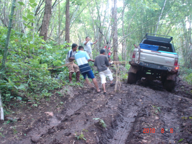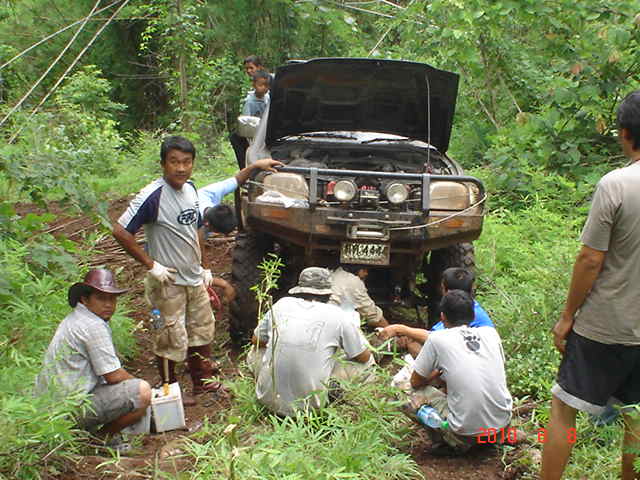 ทางพี่อ้นเลยเปลี่ยนใจให้ พี่หนึ่งมาวิ้นรถพี่เล็กแทนเอาขึ้นมาแล้วมาซ่อมกันข้างบน ล็อกให้เพลาข้างหนึ่งหมุน ช่างมวลเปิดเพื่อเชื่อมดอกจอกให้ขัดกันไว้ด้านหนึ่ง ถึงตรวนี้พวกเราเก้าคันเดินทางมาได้เพียง 1 กิโลเมตร ดูเวลาก็ป้าเข้าไปบ่ายสองแล้ว เหลืออีกยาว เลยพักกินข้าวกันตรงนี้ก่อนเพื่อสู้กันต่อ เราออกเดินทางกันต่อก็ต้องใช้เวลา พี่นันต้องกลับมาลากเพื่อนคือพี่เล็กตลอดทาง แค่ลำพังรถคันเดยวก็ขึ้นยากแล้วเพราะเป็นทางขึ้นตลอด ในช่วงนีใช้เวลาอีกสามชั่วโมงโดยได้ทางพี่อ้นคอยดูแลตลอดทาง อีก 3 กิโลเมตรเรามาถึงต้นไม้ล้มก็เกือบห้าโมงเย็น พี่แก่ดูแล้วบอกเอาลายเหมือนขามา ก็ผ่านมาได้ทุกคัน หมดช่วงนี้ก็เดินทางกันมาทำความเร็วกันได้ไม่เกินสองกิโลเมตรต่อชั่วโมงเพราะต้องค่อยประคองรถพี่เล็กออกมา และช่วงกลางคืนด้วยผู้นำต้องค่อยดูลูกทีมที่ตามมากลัวมาผิดลาย รอบนี้ ว เป็นสิ่งสำคัญมาก ต้องมีทุกคัน เพราะจะได้สื่อสารและช่วยกันได้ง่าย เราไม่ต้องกินข้าวเย็นเราหลุดมาถึงหน้าหมู่บ้านประมาณ เที่ยงคืน แล้วแล้วเราเดินทางต่อไปแวะเติมน้ำมันที่ป็ม ปตท ก็มีคนนอนพักก่อน และมีบางคันจับกลุ่มกันกลับบ้านเพราะมีงานในตอนเช้า