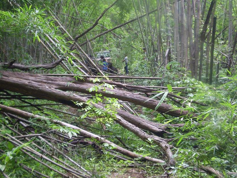 เราเดินทางมาถึงต้นไม้ใหญ่ล้มประมาณบ่าย สองครึ่งจากจุดนี้ก็จะเหลือระยะทางอีก 4 กิโลเมตร เราเสียเวลาตรงนี้อีก หนึ่งชั่วโมงเพราะมีให้เล่นสองลาย และต้องวิ้นขึ้น เลยแบ่งออกเป็นสองกลุ่มเพื่อนทำเวลาออกขวาขึ้นข้างเขา ออกวซ้ายหลบต้นไม้ จุดนี้ พี่แก่ขอนลอยเป็น leader เพราะเมื่อทริปที่แล้วมีประสบการณ์ขึ้นโดยไม่ต้องวิ้น ที่เหลือลูกทีมอีสี่คันวิ้นทุกคัน ส่วนลายขวา พี่เอกขอนลอยนำทางขึ้นดูเหมือนอยากแต่รถที่ตามมาอีกสามคันผ่านมาได้แบบคนมีของ แต่หลังจากสอบถามดูรถจากอูช่างมวล ให้ลูค้าใส่ของหลังเป็น ดิฟล็อกทั้งหมด หน้าเป็นเต็ด ก็ผ่านได้สบาย จากจุดนี้เป็นช่วงขึ้นเขาก็ต้องมีกันอีกคนละหนึ่งวิ้น ยกเว้นพี่เอกกับพี่แก่เช่นเคย ( สงสัยสองคนนี้กินของเขาไปเยอะ หรือไม่ผมว่าน่าจะหมดไปเยอะ วิ้นของพี่ทั้งสองก็ติดมาไม่ยอมใช้หรือว่าพังไม่กลัวครับพี่ทั้งสอง ) จากจุดนี้ที่เหลือทางลงตลอดสองกิโล ทุกคนต่างดีใจถึงไม่มืดแน่นอน แต่ก็ยังต้องใช้เวลาตัดไผ่อีก คันนำทั้งตัดทั้งดันจนรถมีรอยรอบคัน ลองสอบถามดูได้ความว่าไปกินรถไถ่มา (ไถ่เงินภรรยามา) เสียง ว บอกมาว่าคันนำถึงปลายทางแล้วทุกคนสบายใจแล้วมาถึงกันประมาณ ห้าโมง มาถึงเรือยังไม่มาเลย หิวกันแล้วต้องกินของเก่ากันก่อน แต่ว่าได้กินบรรยากาศรอบแพชาวดงก็หายหิวแล้ว คืนนี้มีมื้อคันมีดนตนีฟัง นอนสบายมีที่นอนและผ้าห่ม สบายเหมือนอยู่บ้านไม้ต้องมานั่งทำกลับข้าวเล่นน้ำกันสนุก บรรยากาศในแพเป็นอย่างไรลองขับรถเข้ามาดูนะครับ