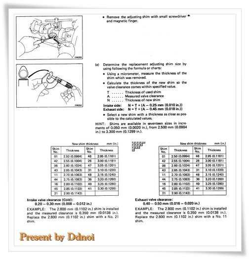 ค่าความหนาของซิม..ใหม่.. ได้จาก = ค่าความหนาของซิมเดิม + (ระยะห่างของวาวล์เดิม - 0.25 ม.ม.) อันนี้ไอดีนะ ส่วนไอเสีย จะ - 0.45 ม.ม.