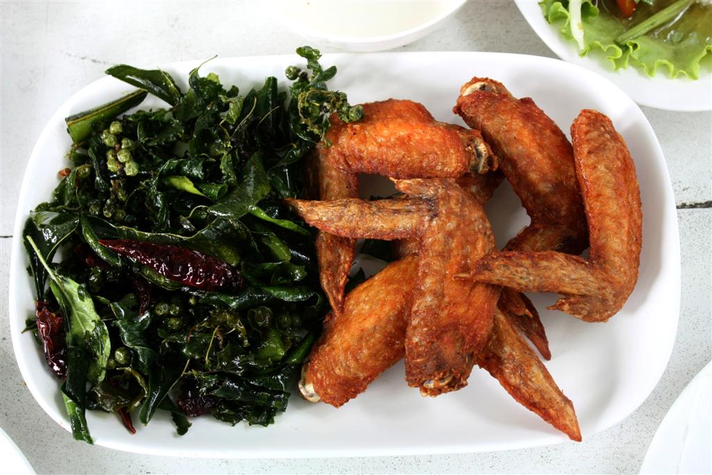อาหารที่ร้านสวนเมืองพร ลำตะคองครับปีกไก่ทอดสมุนไพร พริกไทสด อร่อยมากๆ