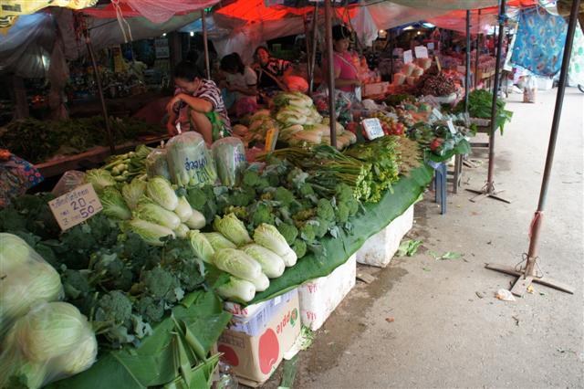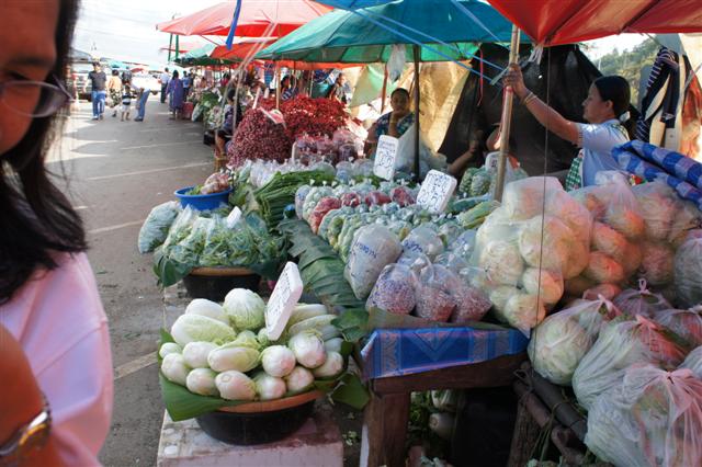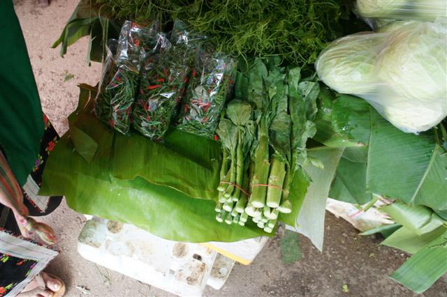 พริกแม้ว หรือพริกขี้หนูสวนบ้านเรา ถุงละ 10 บ. คะน้าต้นมัดละ 10 บาท ที่เห็นนั่นน่ะ 15 บ.