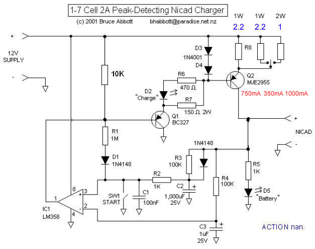 สำหรับมีอใหม่ใช้วงนี้ดีกว่าและมืการแก้ไขวงจรโคยจากวง Q2เบอร์ MJE2955 เป็น TIP2955 ราคาแพงกว่าแต่คุ้มไม่ร้อนใช้แผ่นระบายคาวมร้อนตัวเล็กแค่อุนๆ R7 150 ohm 2w เปลียนเป็น5w เพราะเวลาใช้งานร้อนตอนเริ่มChargeแต่ R8 กลับไม่ร้อนงงครับและเปลี่ยน 1N4148 เป็น 1N4001 2ตัวดว้ยใช้หม้อแปลง2-3Amp 12voltครับวงจรจ่ายไปใช้ dioderetifer 2Amp ต่อแบบ Bridge ครับจะใด้ 15Volt สำหรับCharge 8ก้อนทอลองใช้ 15VAC วัดไฟใด้ 20Vdcวงจรไม่ทำงานครับ 12Vac ดีกว่าครับและทดลองใช้งานฺ Batt Ni-cd 800mA Charge R8 ที่ 2.2 ohm กระแส Charge ที่ 750mA ใช้เวลาประมาณ3ชั่วโมงไฟ D2 "charge"ดับและถ่านไม่ร้อนครับและ SW1"start"ใช้แบบกดติดปล่อยดับใช้ตอนเสียบแบตกด SW1 ไฟ ChargeและBatteryจะติดและถ่านเต็มไฟChargeจะดับดวงเดียวและถ้าถ่านไม่มี่ไฟไฟทั่ง2ดว้งก็จะติดเองครับ