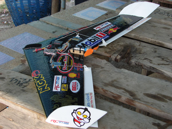 คุณกบ TOT รูปบนนั้นใช้มอเตอร์ CD-Rom ของคุณโหน่งแบบ 2 เซล สปีดของคุณ TD-10แอมป์ ส่วนรูปล่างนี้ใช้มอเตอร์แบบ 3 เซล สปีดของคุณ TD-20 แอมป์เรื่องกินกระแสไม่แน่ใจครับไม่เคยวัด แต่เล่นแล้วลงมาถ้าอัดมากๆ แบตก็อุ่นๆ ครับ แต่สปีดกับมอเตอร์ไม่ร้อน พอดีปีกบินที่พับนั้นใช้ฟิวเจอร์บอร์ดช่วยในส่วนที่ต้องการความแข็งแรง ลำนี้ทดลองลดขนาดท้ายปีกบินจาก 11 ซ.ม. เหลือ 9 ซ.ม. และปลายปีกเพิ่มจาก 9 ซ.ม.เป็น 10.5 ซ.ม. แล้วบินรู้สึกบังคับง่ายไม่ค่อยดื้อเท่าไหร่ครับ