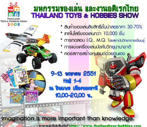 เนื่องในวันเด็กปีนี้ ขอเชิญทุกท่านร่วมงาน THAILAND TOYS & HOBBIES SHOW 2008 สุดยอดมหกรรมของเล่น และงานอดิเรกครั้งยิ่งใหญ่ของเมืองไทย เปิดโลกแห่งจินตนาการไม่จำกัดวัย ทดลอง สัมผัส และบังคับหุ่นยนต์ใหญ่ยักษ์ขนาด 2 เท่าของมนุษย์ ร่วมแข่งขัน เครื่องเล่นบังคับวิทยุ ทางบก น้ำ อากาศ กีฬา ADVANTURE นานาชนิด เกมส์เสริมทักษะ กระตุ้นจินตนาการของคุณหนูๆ 9-13 มกราคมนี้ ณ อิมแพคเมืองทองธานี HALL 1-4 สอบถามรายละเอียดได้ที่ Tel. 0-2967-9999 หรือ www.thailandtoys-hobbies.com