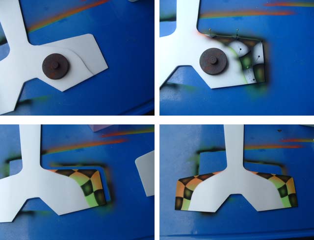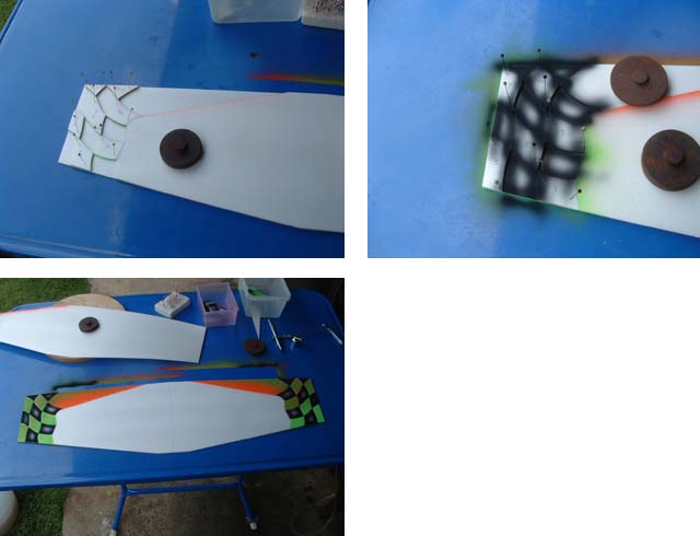 แล้วเวลาที่พ่อนสีแรกเสร็จแล้ว และจะทำการพ่นสีถัดไปก็ให้เอา โฟมที่ตัดไว้มาปิดตรงตำแหน่งที่พ่นไปแล้วด้วย เพื่อไม่ให้มันเลอะโดนกัน