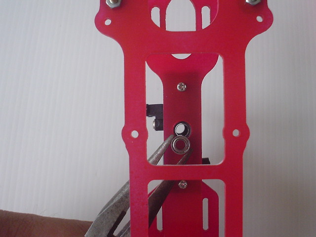 ทำการประกอบเฟรมท่อนบน ตามรูป โดย ร้อยน็อตขึ้นไป แล้วใส่แหวนและลูกปืน ก่อน จึง ยึดน็อตแน่น เพื่อ ให้ รูลูกปืนตรงกัน ทั้งเฟรม พลาสติก และ เฟรมไฟเบอร์