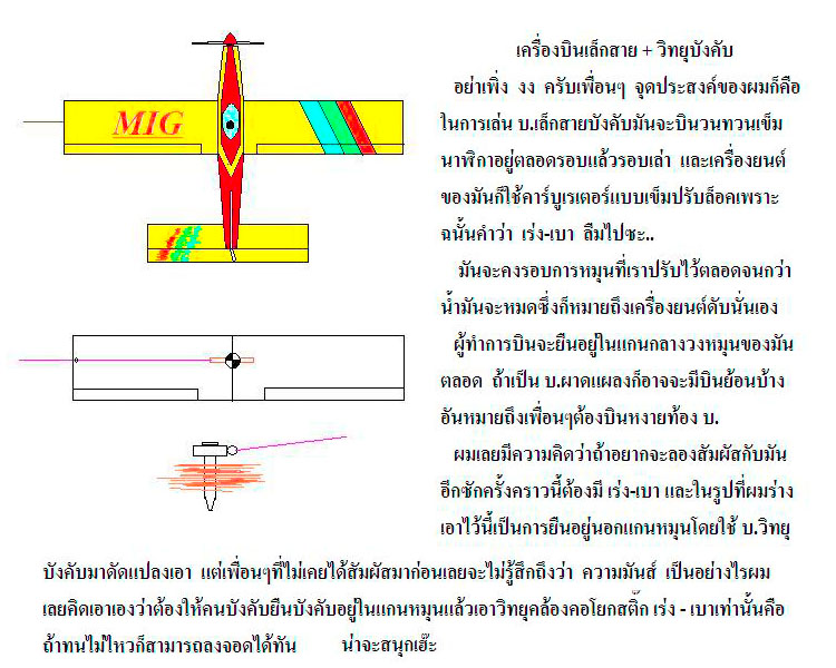 rc + single line น่าเล่นเป็นพวก Combat บินตัดหางกันเพราะวงรัษมีมันจะเท่ากัน โดยใช้ rc 2ch. (เร่งเบา & ขึ้นลง) แต่ที่ยังเป็นปัญหาคือจุดหมุนตรงกลางว่าจะออกแบบอย่างไรที่สายโยงของ2ลำจะไม่พันกัน...?